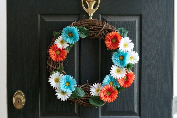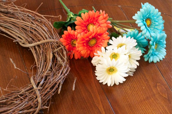 All you have to do is pull your flowers and leafs off the stems and arrange them anyway you like on your wreath. Then use a hot glue gun to glue it all together. You can hang it to your wreath hanger using any ribbon or string.