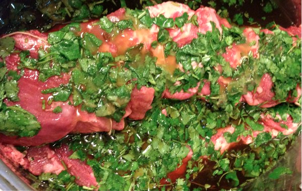 Marinating in the Bourbon- cilantro mixture.  There are not two filet’s in there… just decided to roast the filet “chain” from the trimmings as well.  It wasn’t very good, but the kid were fine with it.  See youtube video above for more info.
