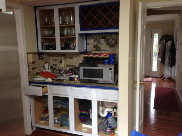 I regret that I forgot to take a picture before the cabinet doors were removed, but here is the before pic with the doors already off.