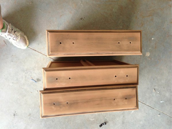 2. The hardware was spray painted with a metallic spray paint after we soaked them in vinegar and water to clean them. It took three coats of spray paint.