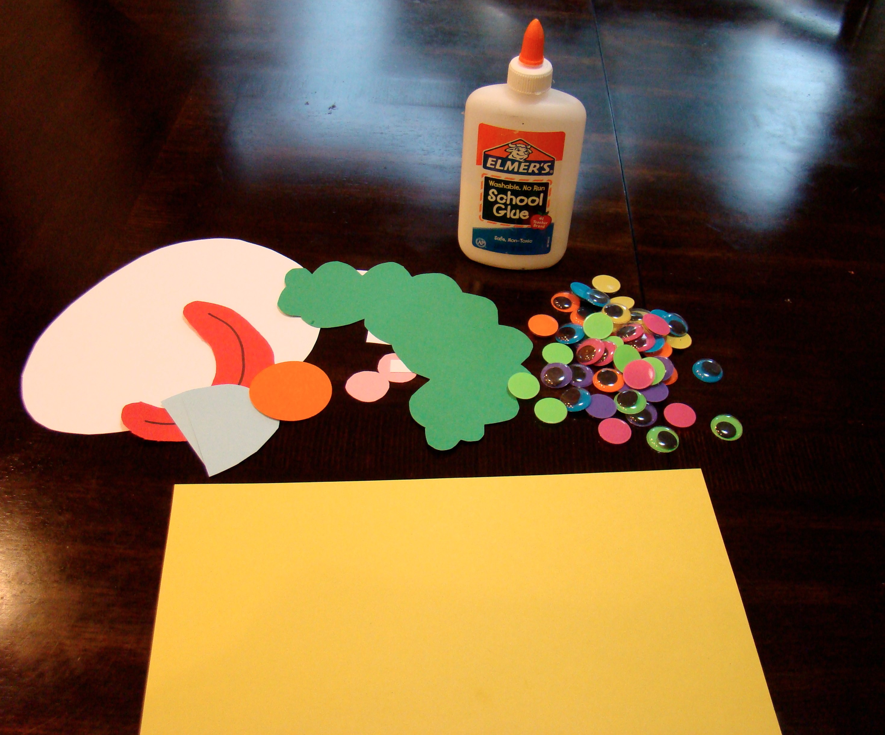 I decided to do clowns because they are already silly to begin with. I pre-cut different shapes that could be used for parts of the clown face, put out a pile of googly eyes and a couple bottles of glue and let the kids create their masterpieces.