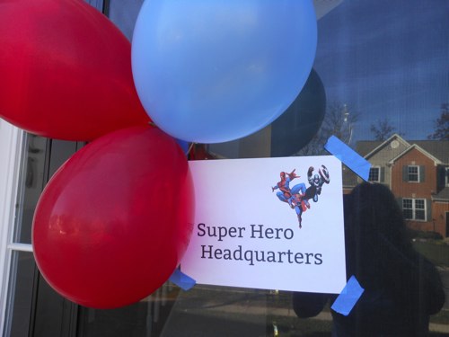 The Decorations: I put a home made printed sign saying “Super Hero Headquarters” with a couple balloons on the door. Used some dollar table clothes and balloons, and hung a few streamers.