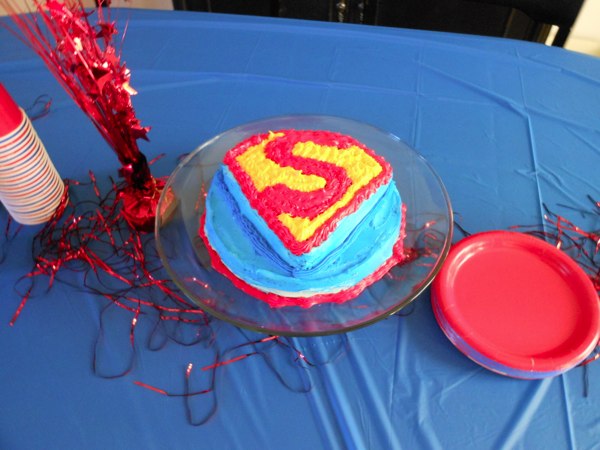 The super villain was defeated and the birthday party was saved. Time for cake! I always make and decorate my own cakes with the birthday boy. It makes it that much more special. This was a super man cake. I also had incredible hulk juice (green sherbet, sprite, and green food coloring – all in a large punch bowl). It was a big hit.