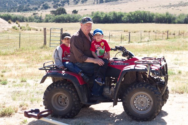 It wasn't all cowboy stuff... Great Grandpa also drove them all around his property on his ATV. The boys sure think he is a pretty cool Grandpa! Great Grandpa, who is now 83 years old is still A LOT of fun!!!