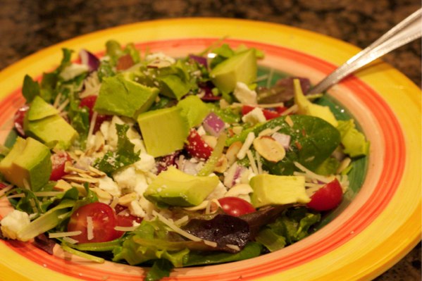 Goes perfect with this salad! Mixed greens, tomatoes, avocado, feta, parmesan, red onions, and sliced almonds!