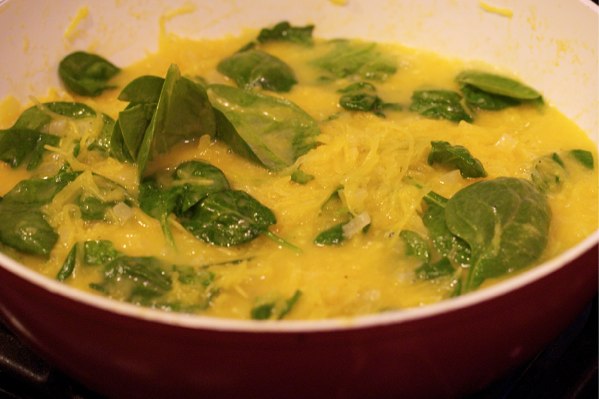 Saute it up with baby spinach, cheddar cheese, onions, and chicken broth. I added a bit too much broth.