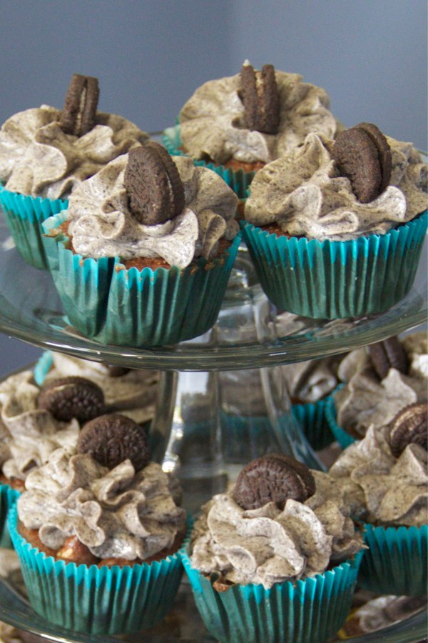 For the frosting: Mix the butter and cream cheese together. Add vanilla and slowly stir in powdered sugar. Crumble the rest of the oreos and mix them in. I used a blender for this. Use your favorite cupcake icing tip to frost cupcakes once they have cooled and decorate them with the mini oreos.