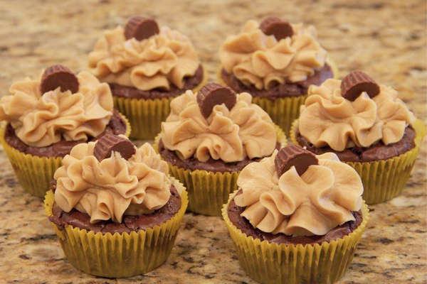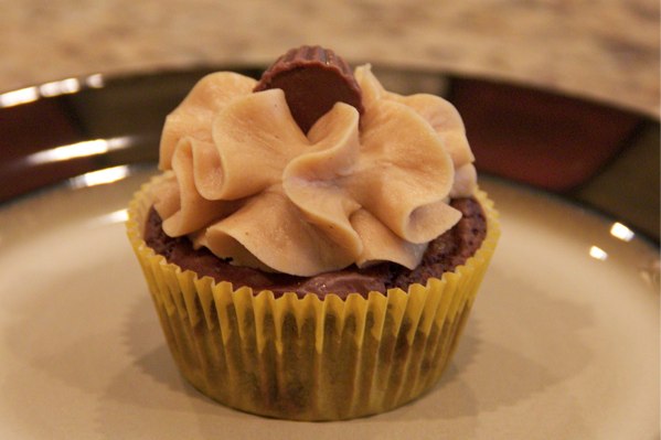 To make the frosting first mix the butter and peanut butter together. Slowly mix in confectioners' sugar. Add one tablespoon at a time of milk and mix until you have your desired thickness. Beat for three minutes to make the frosting nice and fluffy. Add mini PB cups to the top of each cup cake.