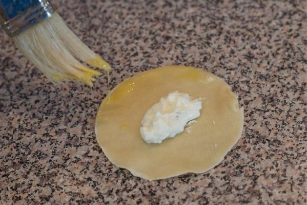 Beat one egg in a bowl. Brush a small amount of egg onto the very end of the dough circle. This will act as the glue.