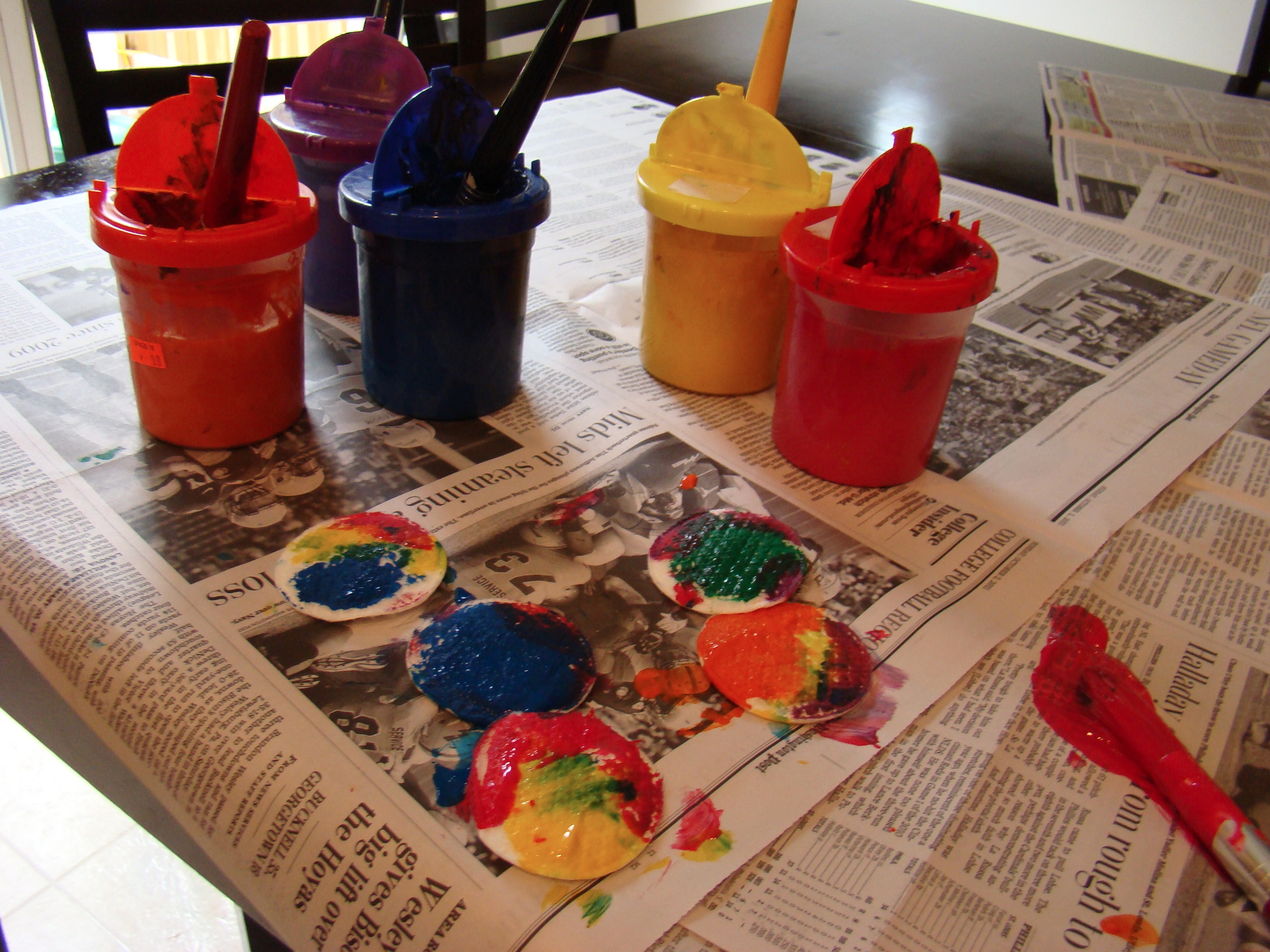 I gave all the kids cotton rounds and paint and let them have at it. I wouldn’t recommend doing this project without layering the table with newspaper first. The kids sort of went nuts painting the newspaper after they ran out of cotton rounds.
