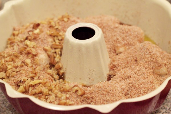 - Put 10 discs in the bundt pan (on top of the nuts) with cream cheese facing up