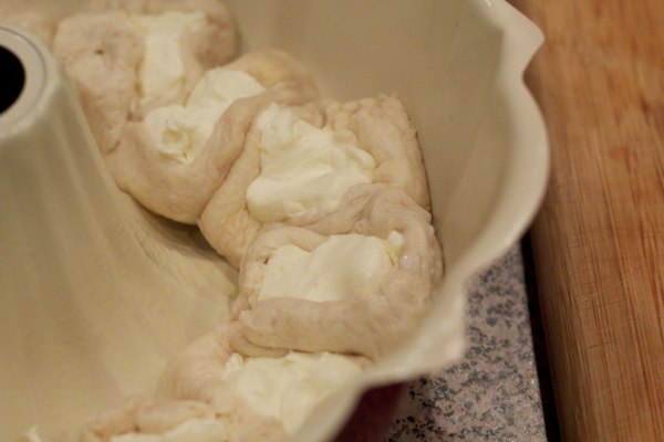 - Place the last 10 discs in the bundt pan with the cream cheese facing down this time