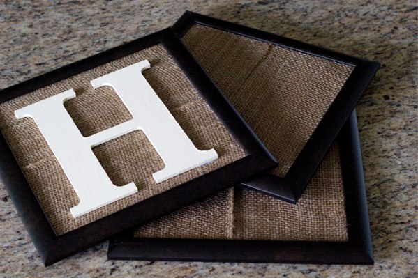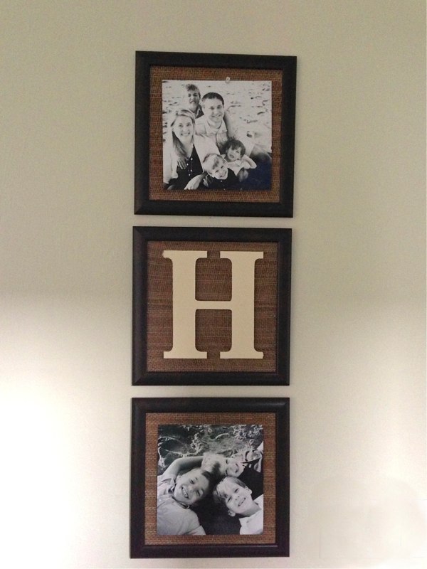 *** Paint your letter. Carefully remove glass from all three frames. Cut cork into squares to fit your frame and glue to inside cardboard backing of the frame. Cut burlap to fit the frames you picked out and glue the corners unto the previously glued cork board squares. Glue your wood letter to the middle of own of the cork squares. Put your frames back together again and use any thumb tac to put up your square photos.