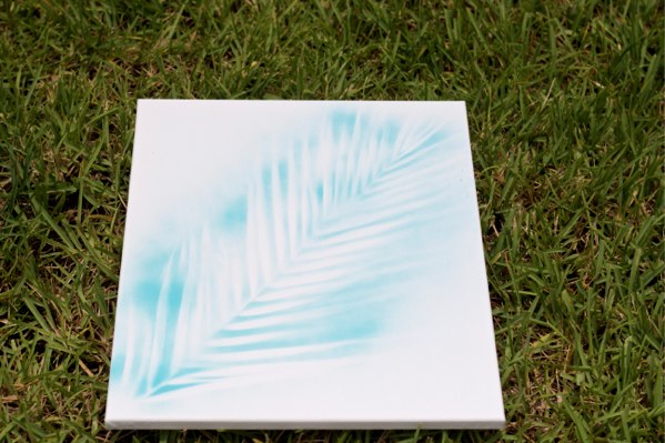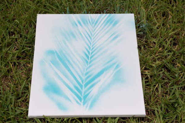 I made these easy tropical leaf prints for $8 total. $5 for the canvases and $3 for the spray paint (after using my 40% off coupon found here). My guest room walls were pretty bare so I am thrilled to have something to put on them and give the room some more color. They took all of one minute to make.