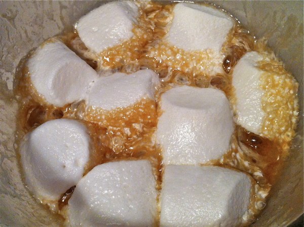 3. Put 8 to 10 large marshmallows in the bowl with the butter and sugar and heat for one more minute.