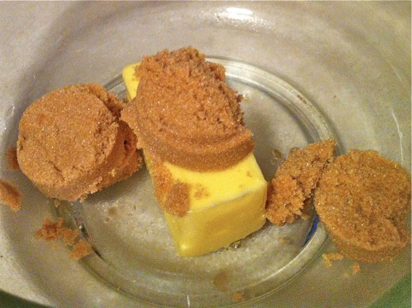 2. Put 1 stick of butter and 1/2 cup of brown sugar in a microwave safe bowl and heat for 2 minutes. Stop it half way through and and stir.