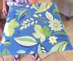 Step 3: Place your fabric on the floor with the pattern side down and place the chair seat down in the middle of your fabric so that the bottom of the chair is facing up. You should still be able to see several inches of your fabric from all four sides of your chair.