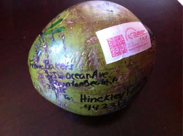 Funny right!!!!?!?! Who knew you could mail a coconut! Just so you know the background story of why my sister sent us this coconut, you should know that my hubby lived in the Philippines for two years before we were married… that adorable man wrote me a letter every single week for two years! He never missed! We were engaged 3 weeks after he came home and married 3 months after that.