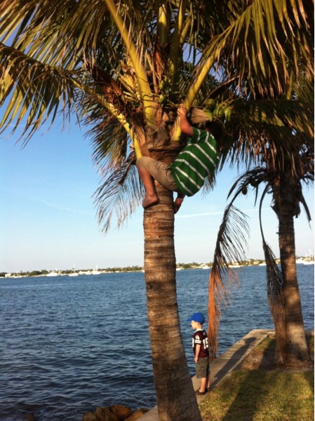 He tries throwing rocks at them, using a sticks to poke at them, pretty much whatever he can think of. Now that we have a six year old who is half monkey – half boy he has encouraged him to climb up the palm trees to pick the young coconuts for him. Don’t believe me… see pics below!