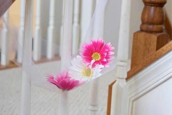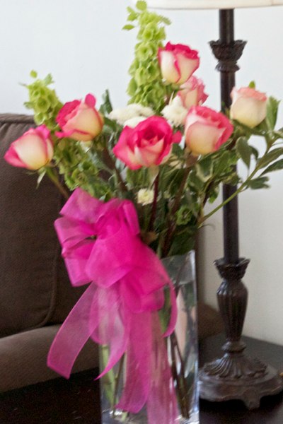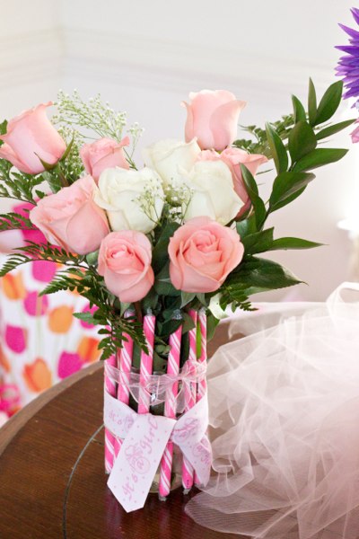 I am moving in 2 weeks and didn’t have a lot of stuff left unpacked, but needed some easy and elegant decorations to make the house look great for the shower. I hung tulle up around the entry way stair case and put cute little flowers in it. It turned out really nice. I also have a fabulous friend who does flower arranging who put together a few gorgeous pieces to place around the room.