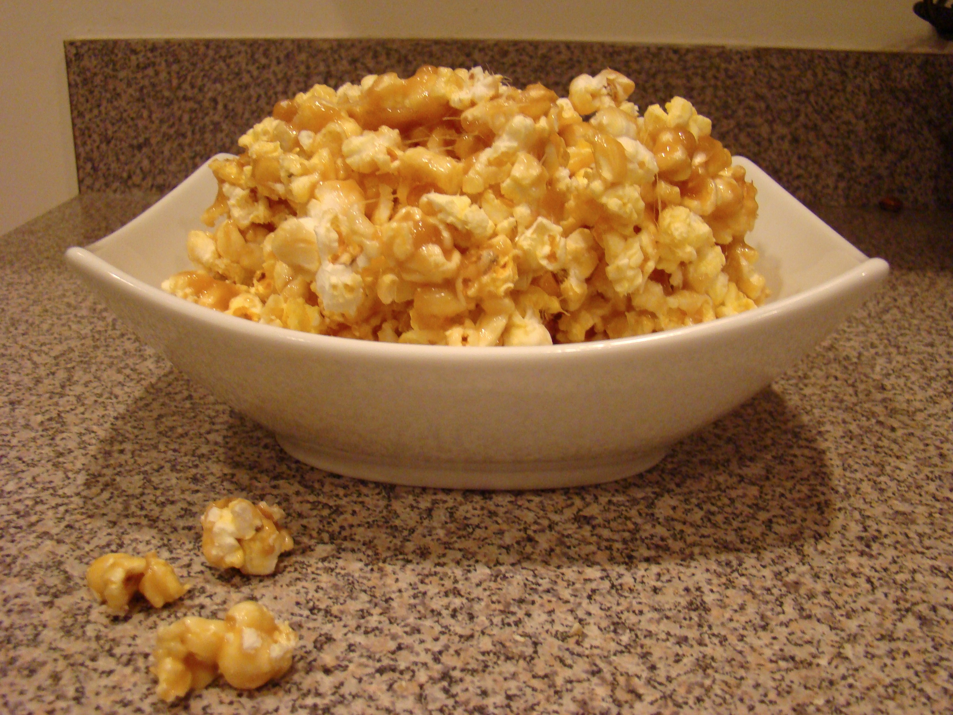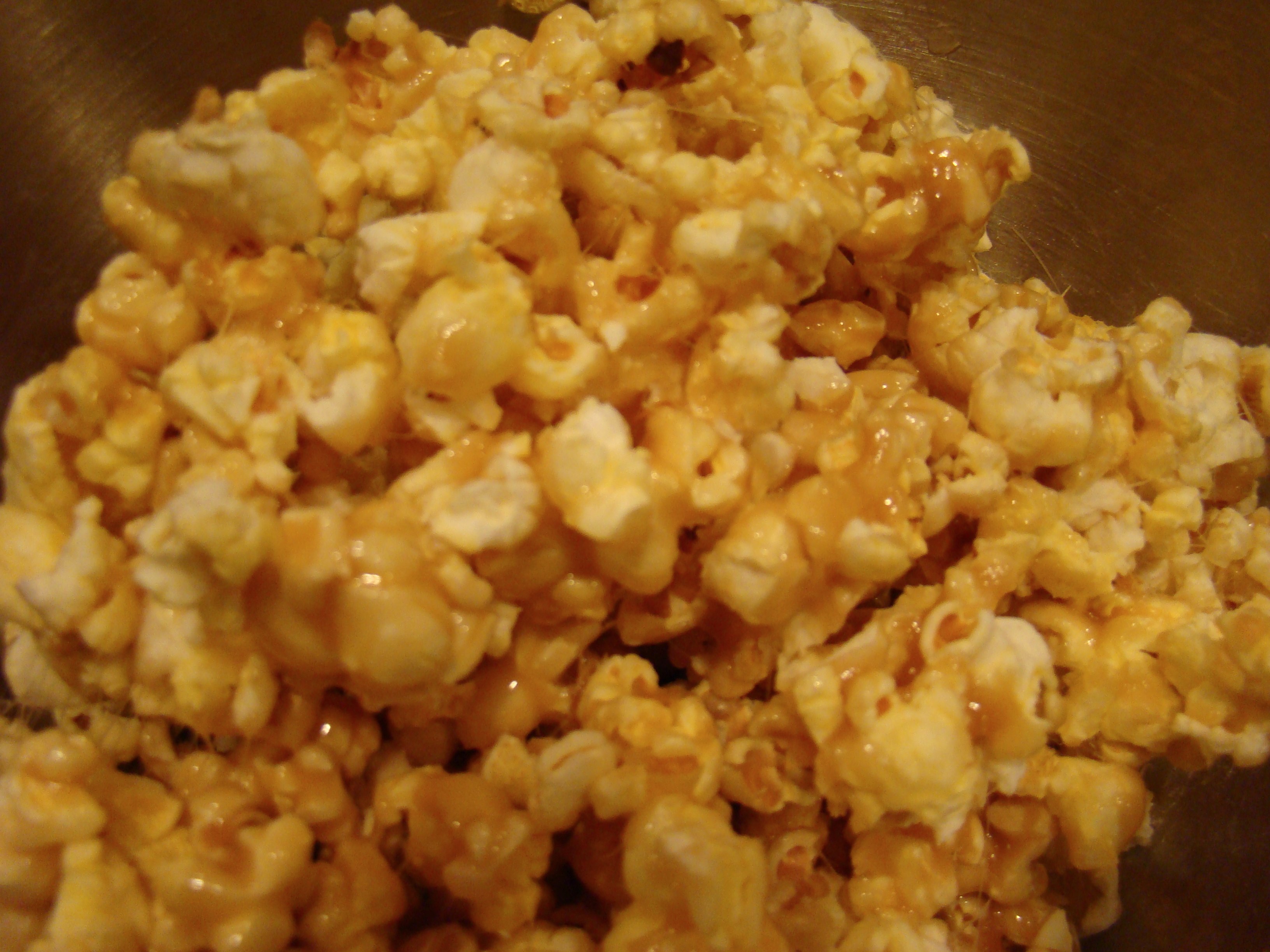 ***Pop popcorn as usual. Put the popcorn in a bowl, but make sure you remove all the unpopped kernels first. Melt the butter in a small saucepan with the sugar and corn syrup. Bring to a boil. Reduce the heat and cook for a 2 to 3 more minutes. Stir with a spatula constantly. The longer you cook the caramel, the harder it becomes. I like mine semi-crunchy without being too hard so 3 minutes was perfect for me. Pour the caramel over the popcorn and mix well. Delicious!