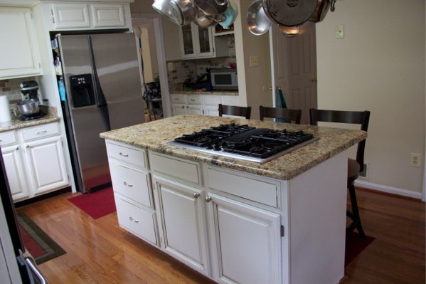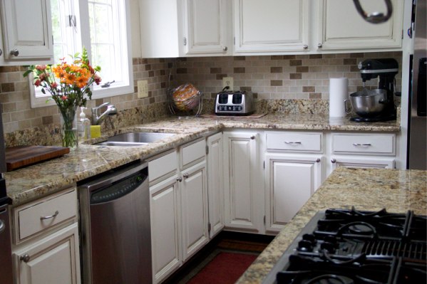 6. After waiting another 24hrs, I used Valsar antiquing glaze to antique the drawers, cabinet doors, and trim. I use the Valspar gel because it is already mixed and ready; no need to add a thing to it. This is really the fun part. Use a foam brush and paint a thin coat over the desired area (I really only focused on the crevices as I wanted it to be a very light antique look), then using a lint free rag, wipe it all off. Some of the glaze will remain giving it an antique look. You really can’t screw this one up since you just keep wiping it off if you want less and repeat it if you want it more heavy. I keep a wet rag nearby also so that I can wipe parts even cleaner if they look smudged.