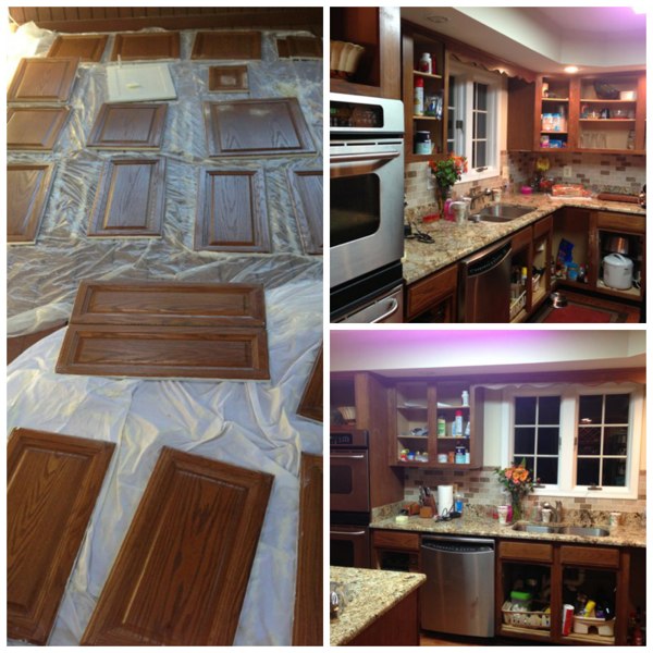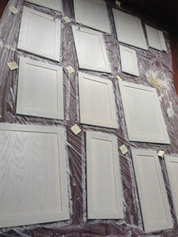 1. Remove all the cabinet doors and hardware. I numbered all the doors using post it notes first. I put one post it note on the back of the cabinet and one with a matching number where the cabinet door was removed. This saved me from having to puzzle through figuring out where each door went when I was finished.