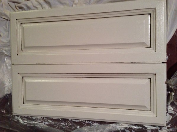5. I then did two coats of paint. I used an off white color and got the Benjamin Moore Active paint in the satin finish. Satin so it is easy to clean food and spills and the the Benjamin Moore Active brand because my research showed me that this paint hold ups really well on cabinets and has a really nice finish to it making a poly coat unnecessary. I was wary of doing a poly coat on white cabinets as it often yellows over time. After waiting 24hrs from the last paint coat on the back of the cabinet doors I turned them over primed and then painted two coats. Oh, I almost forgot… I added Floetrol to my paint each time I put pain in the roller pan. This slows down your drying time which will decrease any brush or roller marks on your cabinets.