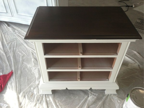 2. After this, I cleaned off all the dust and put on two coats of primer (I recommend Zinsser oil based primer) to the bottom and started my first coat of stain on the top. Make sure you wait until everything is completely dry before giving 2nd coats. I actually did 3 coats of wood stain on the top to get it as dark as I wanted it to be. I used the stain color called Kona.