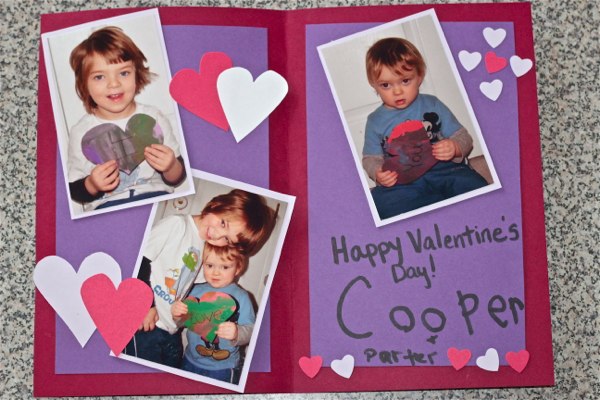 All you need to do is cut out three large hearts from construction paper. Let the kids paint or decorate them. When they are done, use a thick black marker and put and “I” on one, “Love” on the other, and “You” on the last one. Take a picture or your little guy holding each heart. Use the pics to make a cute Valentine’s Card. Top it off by having your little guy write a letter in his or her own handwriting.
