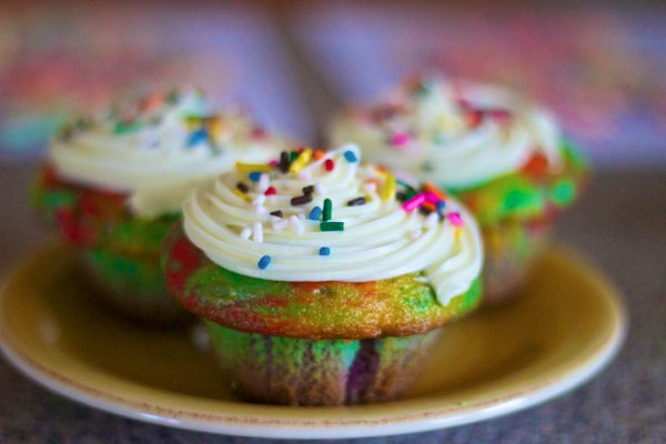 All you need to do is use white or yellow cake mix and prepare it as the directions say. Divide the cake batter equally between 4 or 5 bowls and add food coloring to each bowl. Put a small scoop of each color in the cupcake papers and bake as directed!