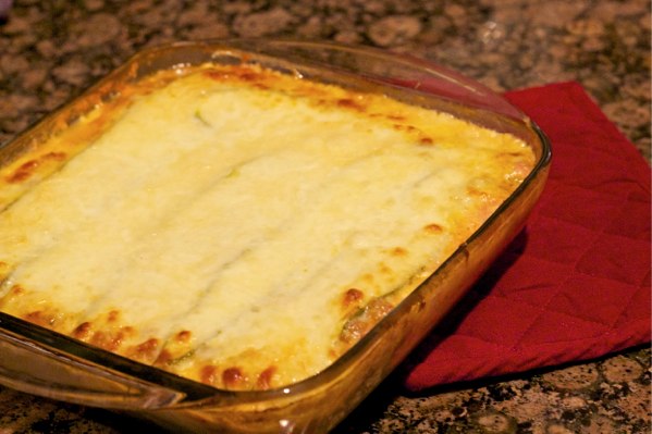 In a 9 x 12 casserole dish spread the tomato sauce down on the bottom. Then layer with strips of sliced zucchini. Spread the ricotta mixture next, then the mozzarella cheese. Now repeat until you are out of zucchini. End with zucchini, sauce, and mozzarella cheese. I also sprinkled the left over shredded parmesan cheese on with the mozzarella. I might have cut my zucchini a little too thick because I had only enough to fill a smaller 9 x 9 pan.