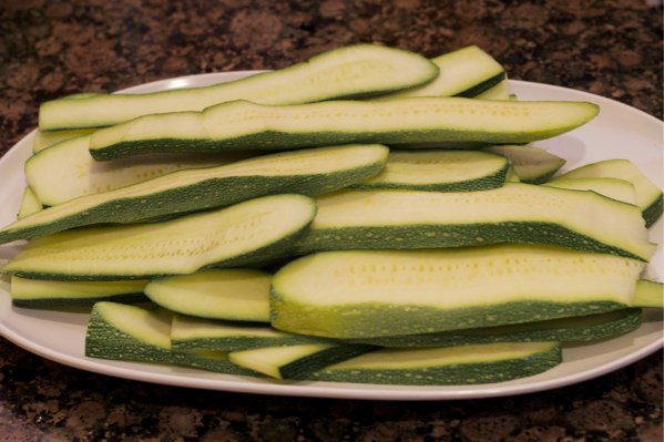 Salt your sliced zucchini and let it sit for 10 minutes or so. Then use a paper towel to dab all the excess water from the zucchini. Zucchini adds a lot of water when cooked and salting it helps take some of it out. Now, grill the zucchini on a grill or grill pan.