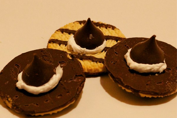 All you need are some Hershey kisses, Keebler Fudge Striped Cookies, and frosting. I am sure it would look better with Halloween Orange frosting, but hey it is 930pm the night before Halloween and I am just throwing this together. Last minute planners miss out! I blame it on tonights soccer game… which we sadly lost 5 to 1.